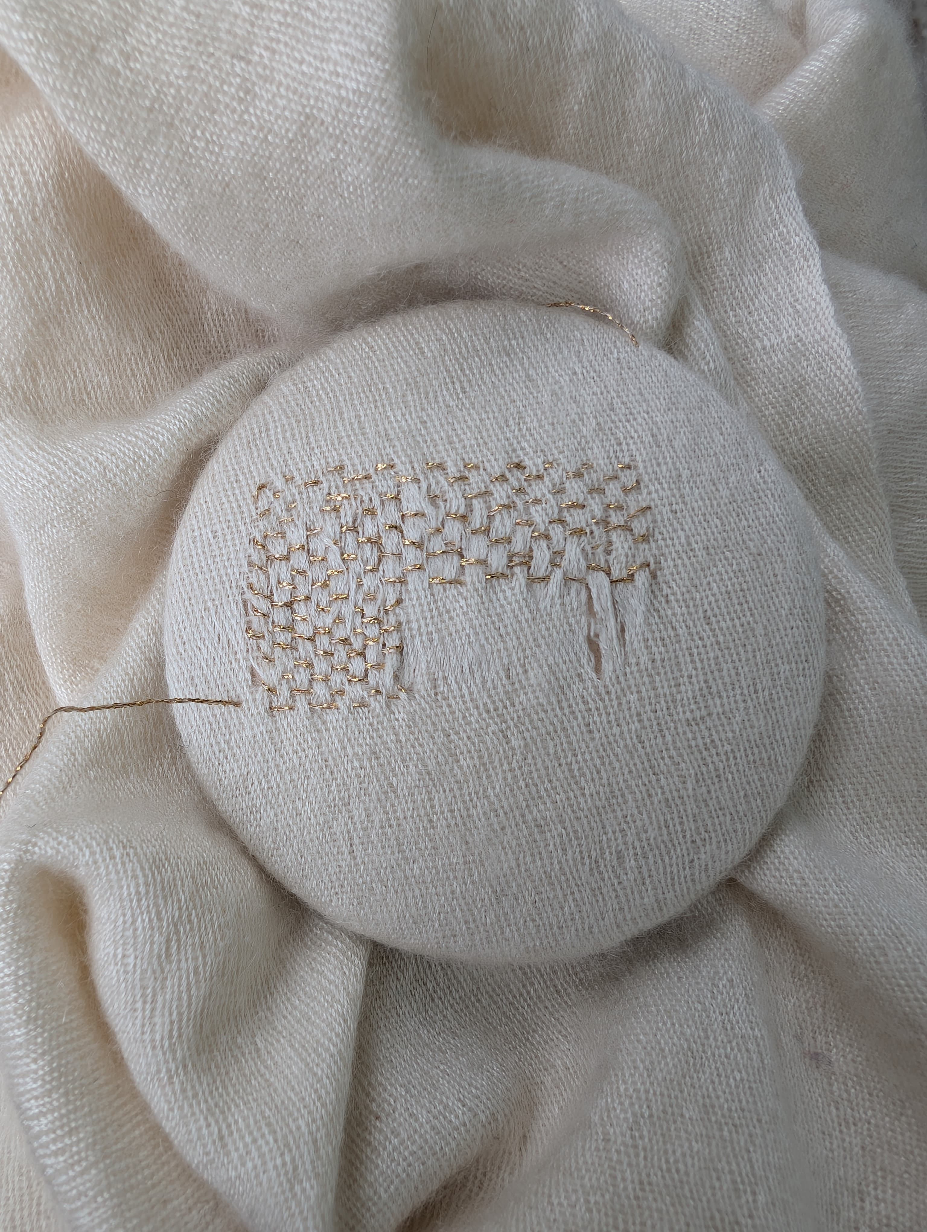 Die für Kaschmir Kintsugi typische Reparaturmethode ist das Swiss Darning, oder auch Maschenstich genannt. Das bedeutet, die Masche des Pullovers wird imitiert.
