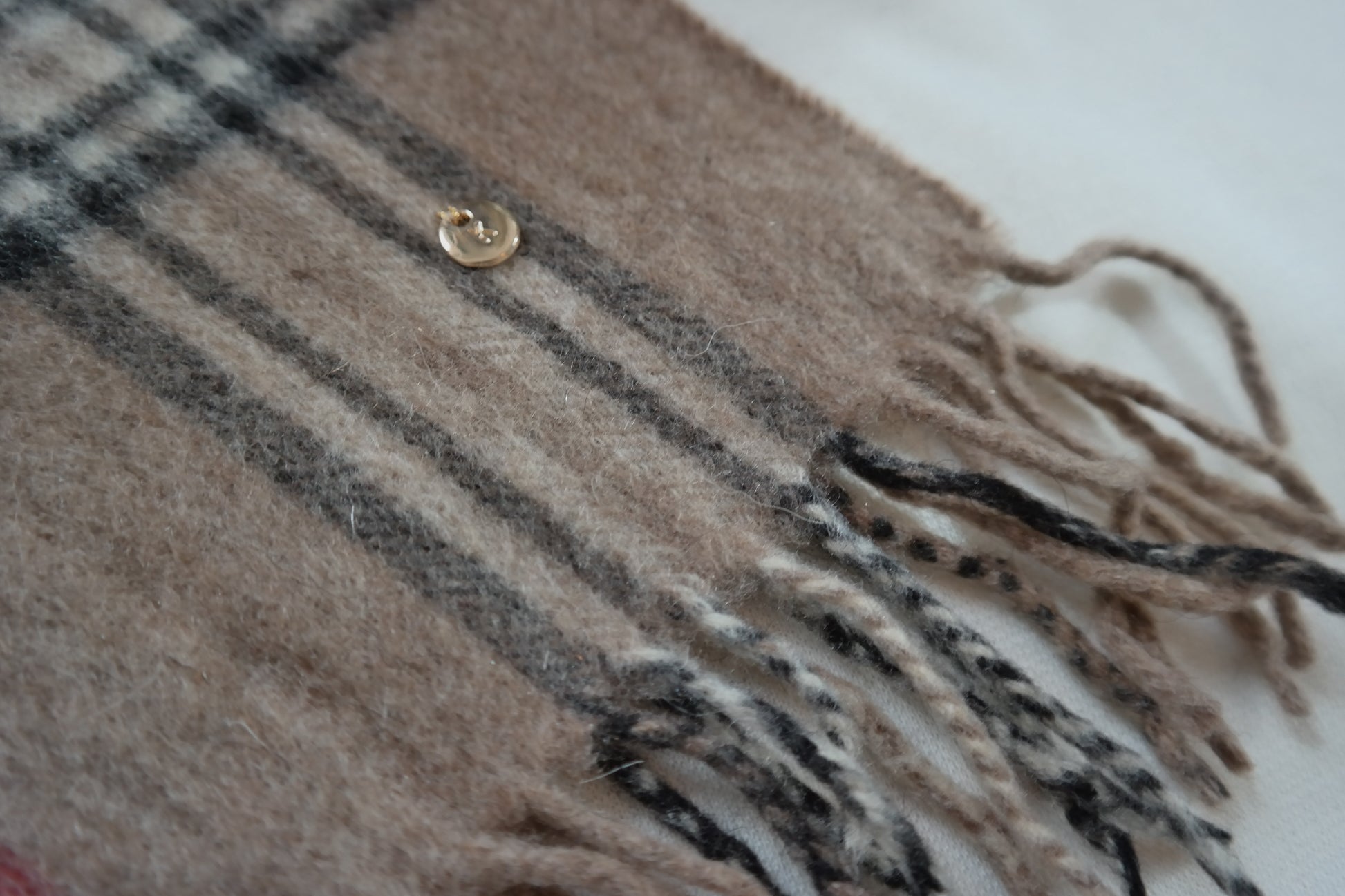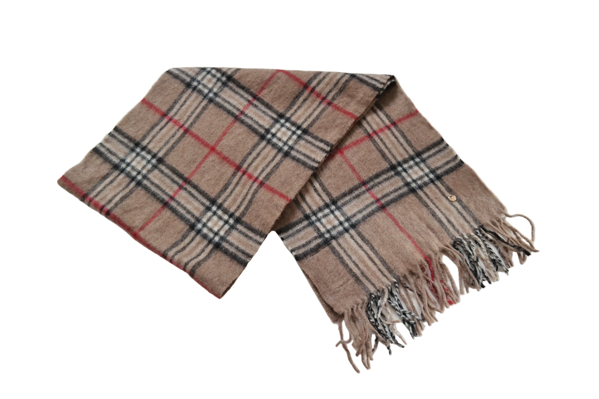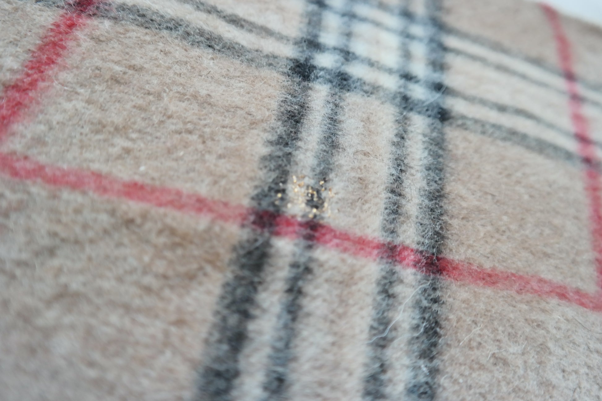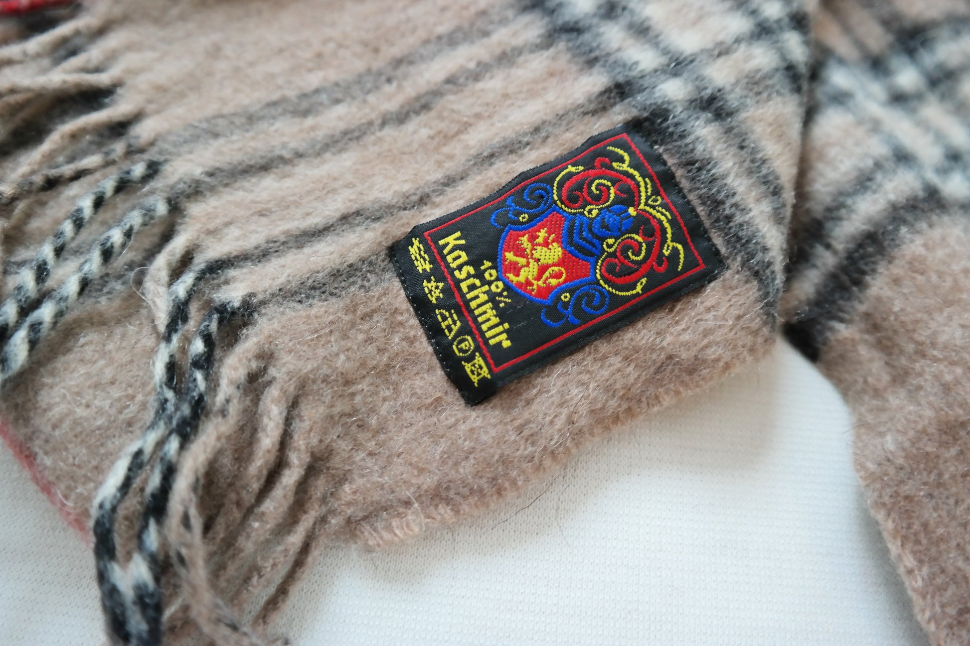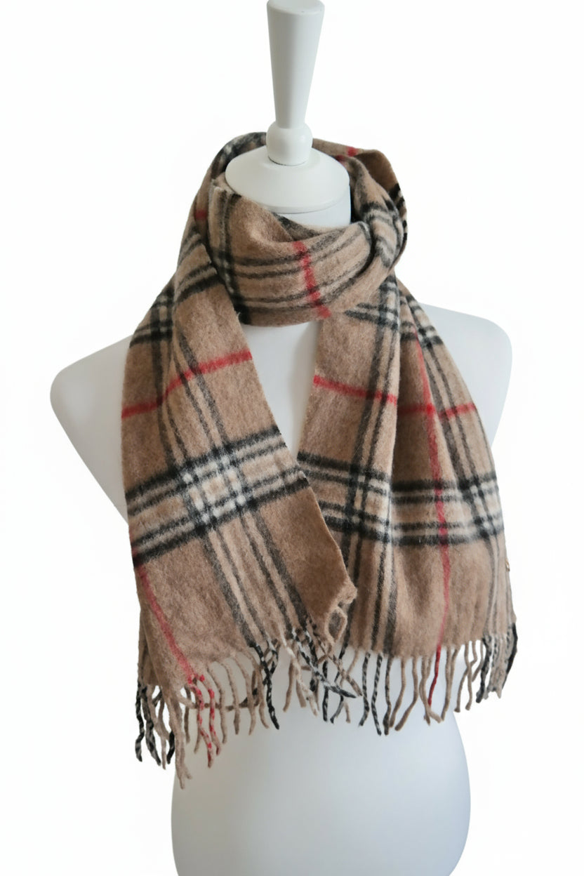 Kaschmir Schal Hellbraun mit Tartanmuster und goldenen Reparaturen
