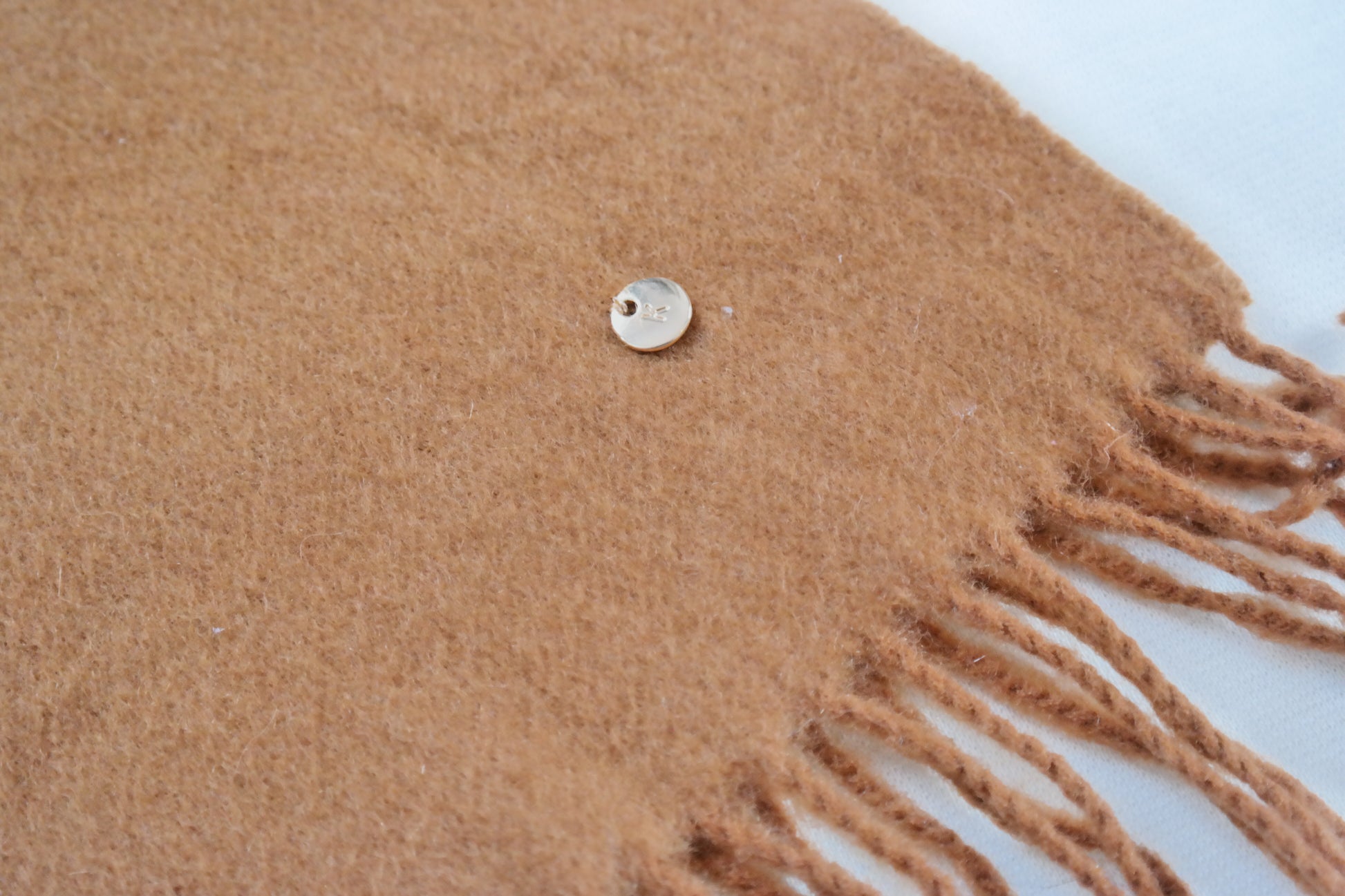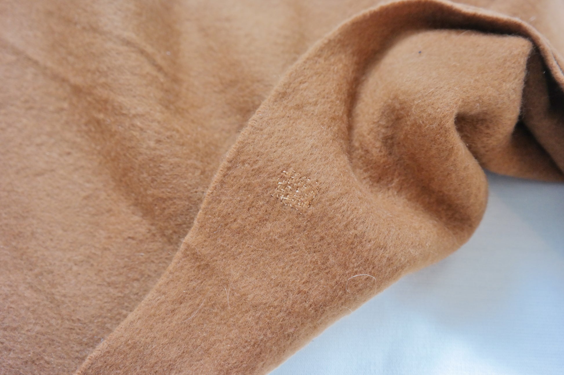 Dieser Second-Hand-Kaschmirschal wurde von Kaschmir Kintsugi sorgfältig aufbereitet und an kleinen Schadstellen mit goldenem Faden repariert.