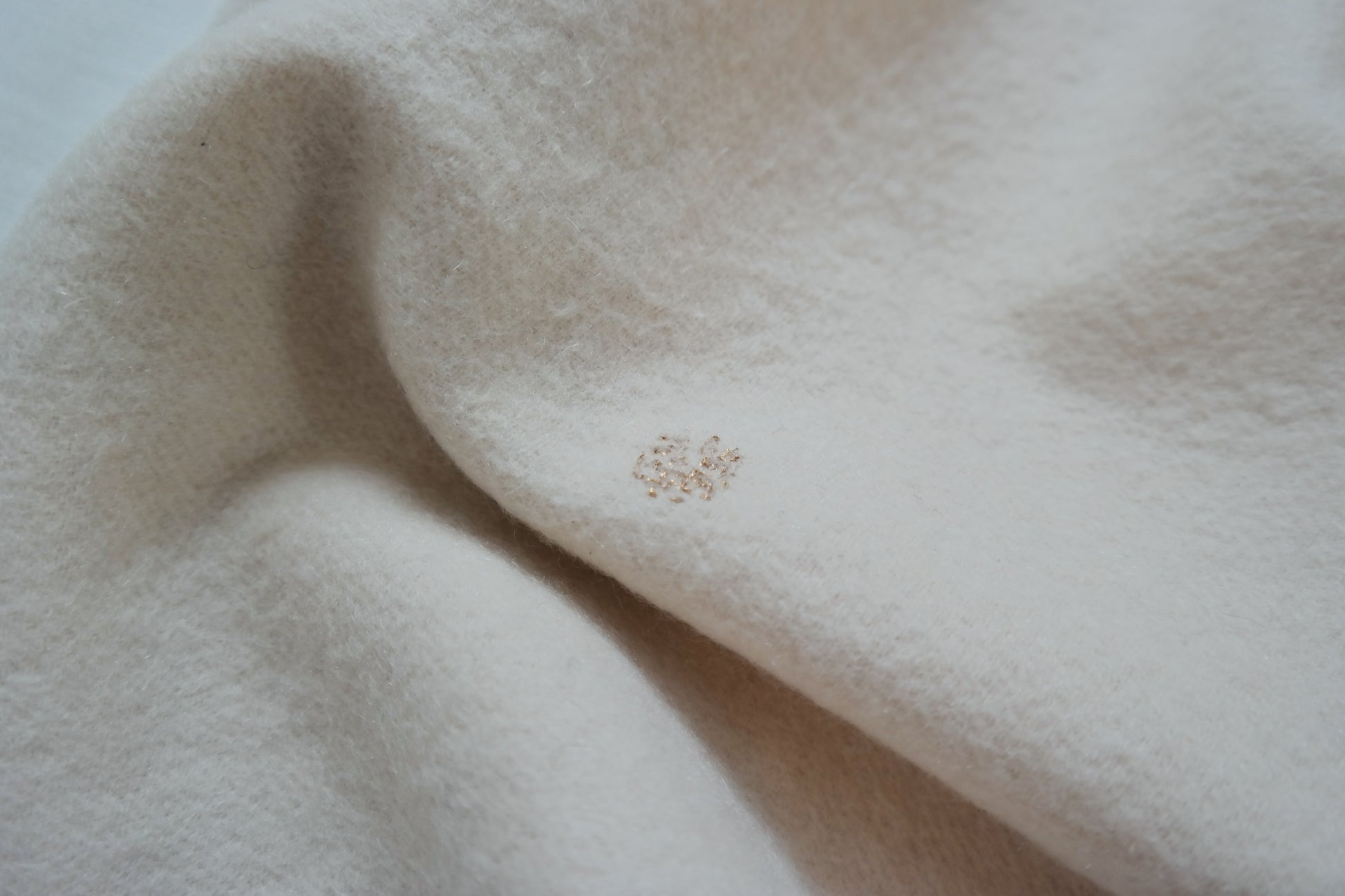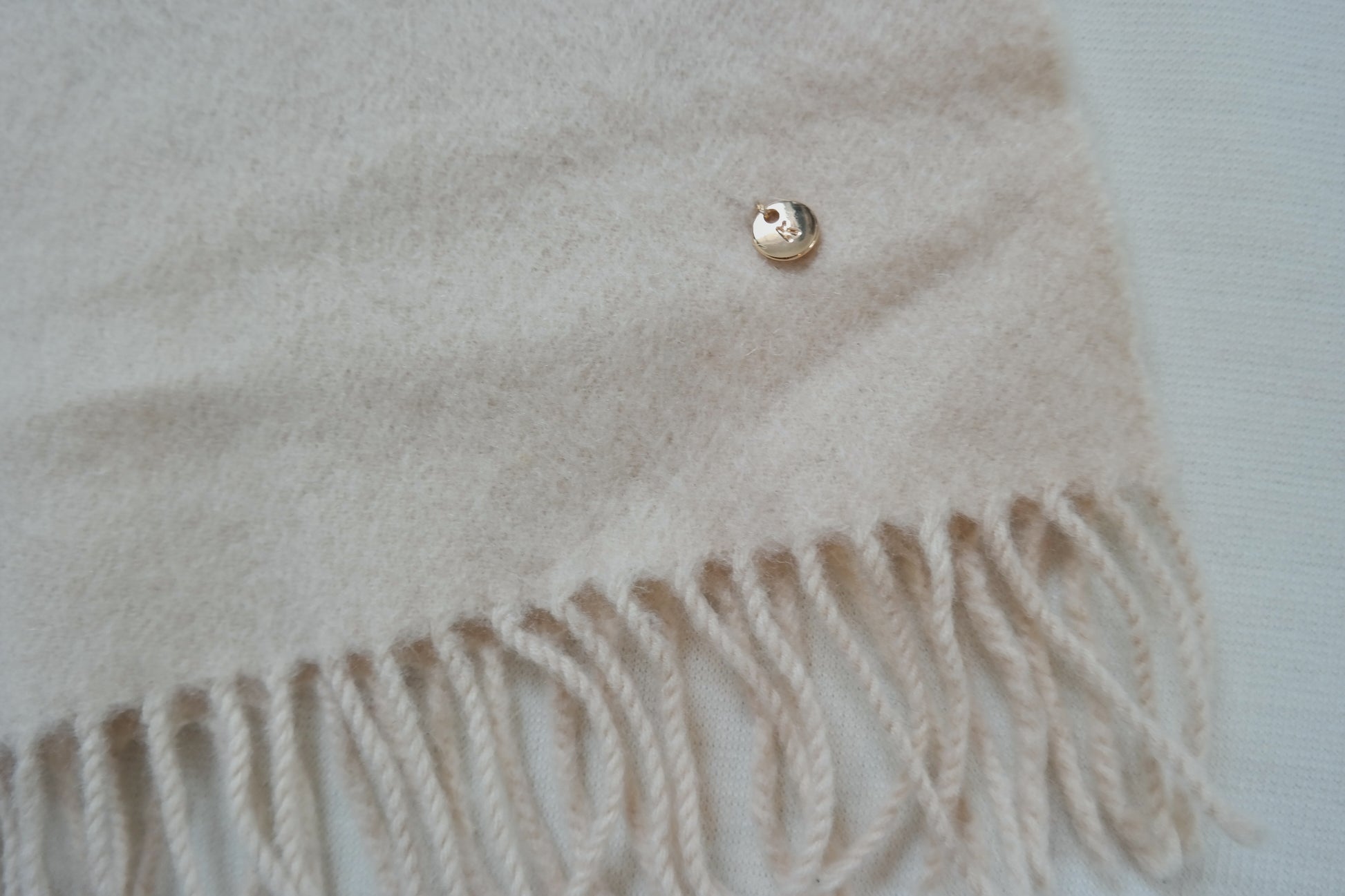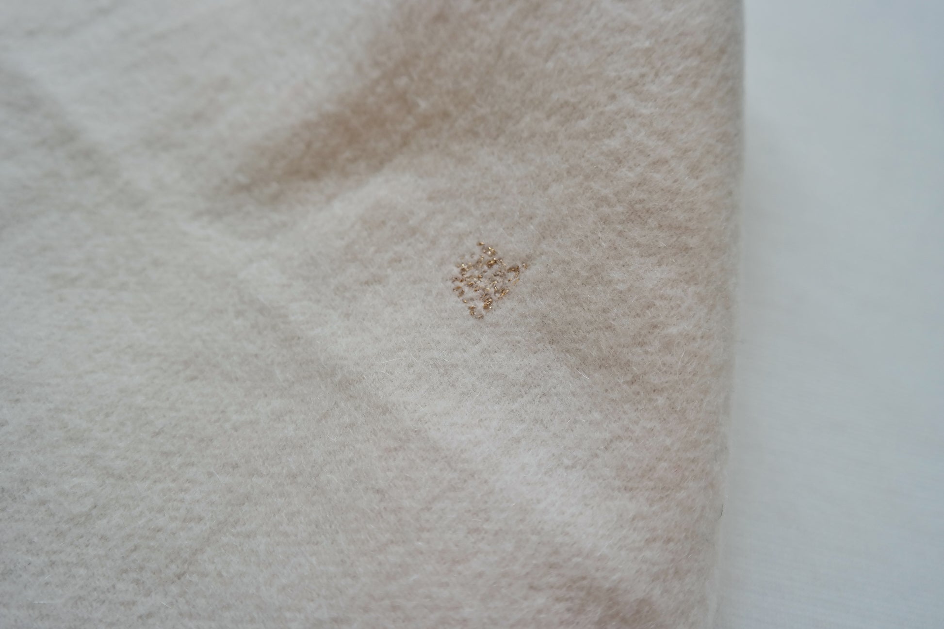 Dieser Second-Hand-Kaschmirschal wurde von Kaschmir Kintsugi sorgfältig aufbereitet und an kleinen Schadstellen mit goldenem Faden repariert.